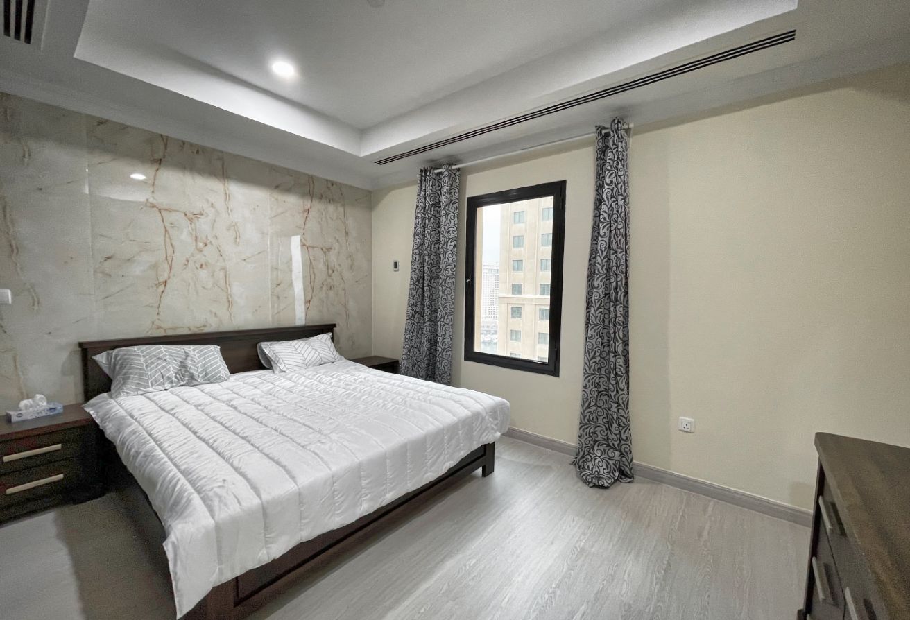 This stunning 1 bedroom apartment offers a perfect blend of modern elegance and comfort, situated in one of Dohas most prestigious residential areas. As you step inside, be greeted by a stylishly furnished living space bathed in natural light, courtesy of large windows that offer breathtaking views of the azure sea stretching out before you. Relax in the cozy ambiance of the living room, complete with contemporary furniture arrangements designed for both relaxation and entertainment.